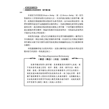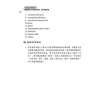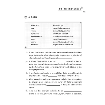本書特色略作說明如下:第一,本書中美國最高法院重要判決範疇涵蓋構思(概念)表達二分原則、原創性、合理使用、聘雇著作、編輯著作、散布權耗盡原則(第一次銷售原則)、電子資料庫、著作權存續期間、間接侵權責任、公共領域,以及公開演播等議題,共計十五則案例。第二,本書為了幫助讀者學習,從每則案例精選出重要法學英文生字叢,讓讀者系統性學習,再以生字填空測驗和翻譯測驗加深印象,同時提供測驗解答讓讀者對照以便發現錯誤之處,進而適時改正。
