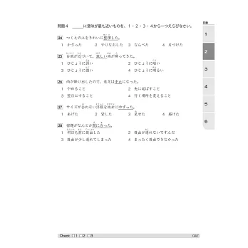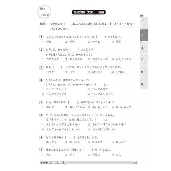 為了讓您有真實的應考體驗,本書完整輯錄「6大回合超擬真模擬試題」,完全複製了整個新日檢的考試配分及題型。請您一口氣做完一回,不要做一半就做別的事。考試時要如臨考場:「審題要仔細,題意要弄清,遇到攔路虎,不妨繞道行;細中求速度,快中不忘穩;不要急著交頭卷,檢查要認真。」