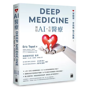 “人工智慧與人類醫師結合的最佳展現將是一場醫師與病人互利的雙贏局面。Eric Topol 是一位對醫療保健和 AI 都有深刻瞭解的醫學權威。我強烈推薦這本書,並希望它能串聯起醫療從業者和 AI 研究員,幫助他們明白唯有同心協力、共同努力,我們才能實現健康長壽的共同夢想。”──李開復