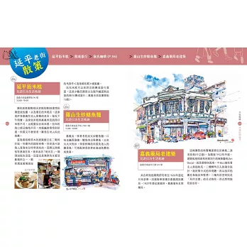 全書分為六大單元,按飲食、藝文、建築和不同地區分門別類介紹,以細膩文字書寫獨到見解,搭配絕美的水彩速寫畫作,帶你細看嘉義讓人心曠神怡的小鎮街景、耐人尋味的建築風采、讓人欲罷不能的台式美食,以及在地文創的新生活力。