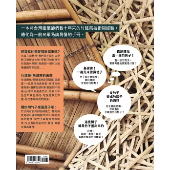 《從竹子到竹房子:給所有人的竹構築指南》,是國內第一本竹構手冊,以淺顯易懂的文字及圖解說明,讓初學者透過本書完整瞭解從竹子變成竹房子的過程。從竹子的生長特性,如何在正確的季節伐採,到竹子的保存,以及使用竹子作為建材需要克服的關鍵,還有詳細的竹構施工方法介紹,甚至竹構與其他鋼構、木構的造價比較,以及國內外案例分享,不但是工具書,也是一本健全我們自然資源利用概念的生活指南。