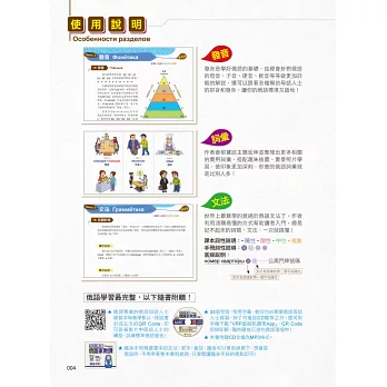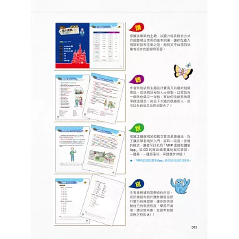 4. 隨身手冊:為幫助讀者能夠隨時查找、方便複習,本書特別附贈「隨身手冊」。內容包含重點文法整理、常用字彙及會話,讓你走到哪,學到哪!