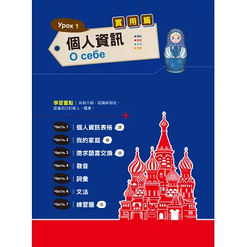 1. 自修課本:本書由二位俄語教學博士親自撰寫及審定,內容完全符合台灣俄語學習者的需求。從33個字母A-Я,到基礎字彙、生活會話,按部就班地解說,聽、說、讀、寫,一本就搞定!且每一章最後都會提供練習題,隨時掌握學習進度。