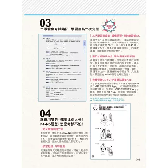 為了受聽力測驗所苦的考生,本書免費附贈CD及VRP虛擬點讀筆App,收錄由日籍老師錄音的聽力題目。只要用VRP虛擬點讀筆App隨手一掃該頁的QR Code,就能馬上聆聽音檔,即便在沒有網路的環境也可以隨時練習聽力。