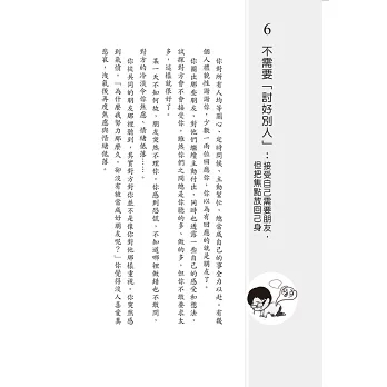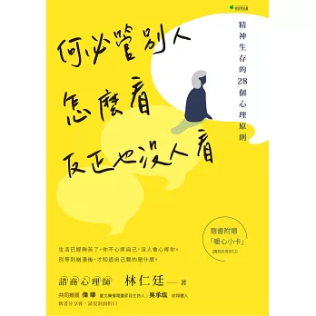 ★自私、抱怨、自卑、委屈、討拍、嫉妒、比較、焦慮、憂鬱、困境、軟弱、失敗、被指正、被否定、被嫌棄、被排擠,甚至親情、友情、愛情、人際關係、情緒漩渦等,所有困擾你的人生疑難雜症,都能在本書找到出口。