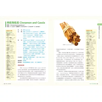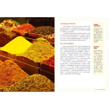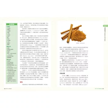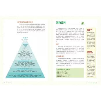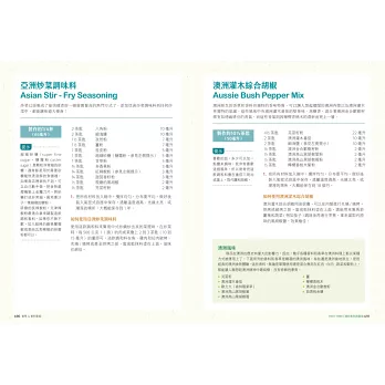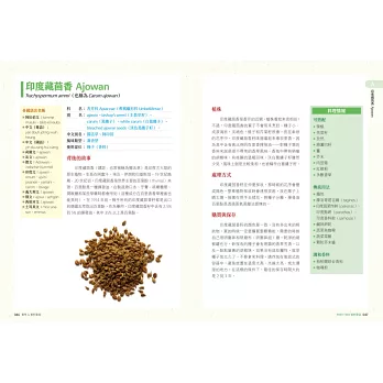 依照英文字母排列,詳細介紹97種香料與香草,分別介紹它們的背景資料、處理、購買和保存方式,也提供這個香料在每個國家不同的名稱。每種香料後面還附有食譜。