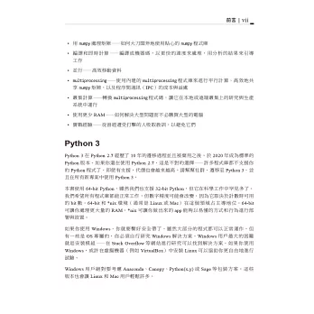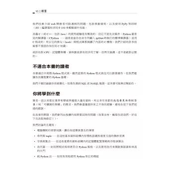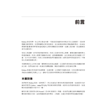 如何利用多核心架構或叢集?如何在不失去可靠性的情況下放大與縮小系統規模?資深的Python程式員可從本書學到許多問題的具體解決方案,以及來自許多公司的實戰經驗,這些公司都運用高性能Python來進行社交媒體分析、生產化機器學習等應用。