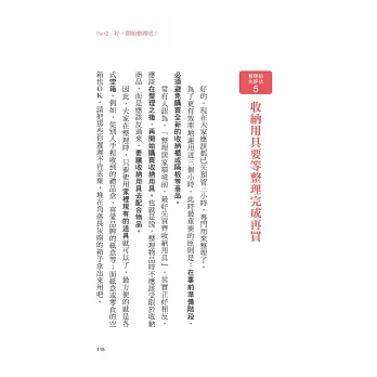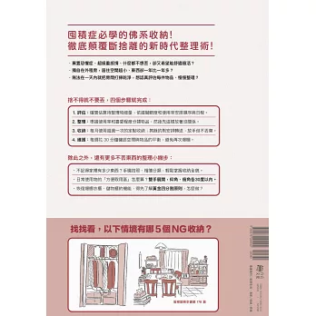 因此,本書也會介紹如何持續維護環境整齊的做法,以及當你因為放下戒心,而不慎失手、導致室內空間再次爆棚時的應對方法。
