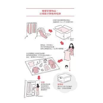 整理的具體做法是,先把所有待整理物品全數裝箱,然後逐一取出、認真評估。主要是以「使用或不使用」、「愛或不愛」為主軸,思考該物品的意義,同時一邊分類、一邊在標籤上寫下物品的意義,如此這般完成整理步驟。