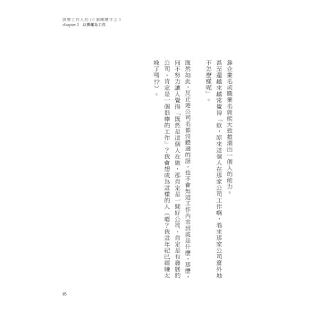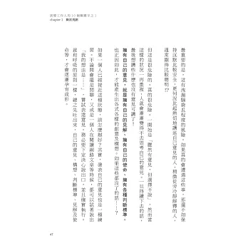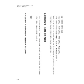 接著,在閱讀本書的過程中,你會自然而然做好磨練該能力的準備;讀完本書後,若能看見稍微不同的風景,發現主管的那張臉看起來不太一樣的話,表示你已經跨出了第二步。