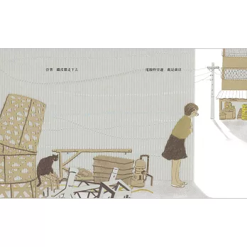 小魚幫爸爸出門跑腿買雞蛋,一路上,她跟著小貓影子「走在屋頂」;一會兒將視線穿過彈珠,成了藍色大海裡的小魚;她戴上被遺忘在樹下的眼鏡,便化身成媽媽二號……故事中小魚淘氣又可愛的活潑姿態,生動表現出孩子的自得其樂,在平淡的熟悉日常裡,流露最純真的童趣想像。另外,書中安插了許多臺式特色物件,鐵皮屋牆、老屋的鐵窗花、巷口陳舊的雜貨店、塑膠罐裡的古早味點心等,簡潔的畫面中增添圖面的可讀性,同時帶出了作者兒時的溫暖回憶,也勾起了你我記憶中的美好童年。