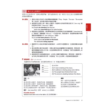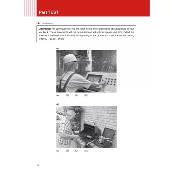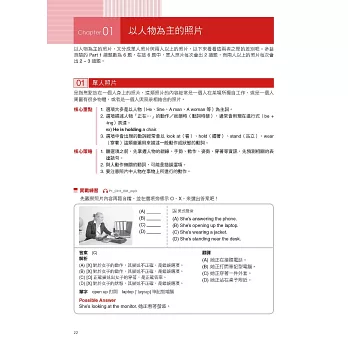將多益試題Part 1 ~ Part4的常考題目,依出題方式分析出各類題型,除了可瞭解該題型出題重點,還可熟悉多益常見的關鍵字與固定的表達。例如在Part1圖片題,考生會知道照片題有分以人物為主的照片之外,還可知道遇到單人照片及兩人以上的照片時該怎麼看出題重點,預測題目會怎麼考,一次掌握各類題型常聽到的句子。