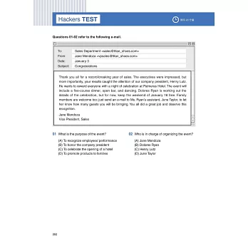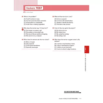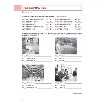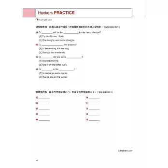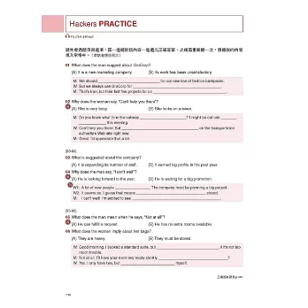 在本書的各個章節裡含有幾種發揮不同功效的練習題題目,如Hackers Practice、Hackers Test,以及Part Test。Hackers Practice主要是測試考生在各單元中所學到的祕訣、策略與表達方式;Hackers Test主要以與實際考題相仿的試題進行初步的測驗,來複習所學會的解題策略;Part Test則是在各章最後,以實際考題來練習作答,進行題數、難度都和真實考題相同的試題,來檢驗自己的學習效果和實力。