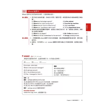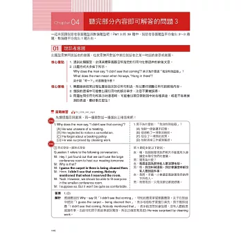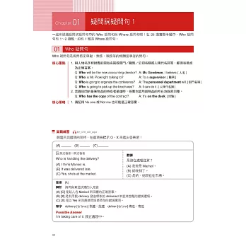 無論聽力或閱讀,書中都將最常考的出題題型分門別類,並且點出其考題重點及破解方式,讓讀者能分門別類進行學習,找出自己考試的弱點。在每個類型的考題之前,也提供最精準的重點整理與學習內容,讓讀者真正學會之後再進行練習,而不是憑感覺、漫無目的地做題目。