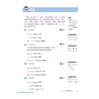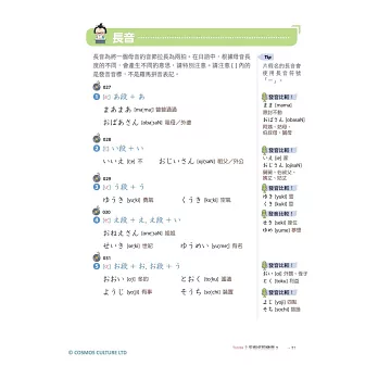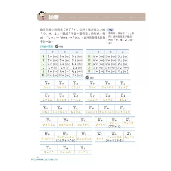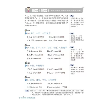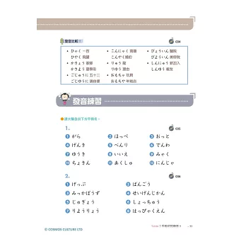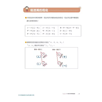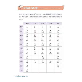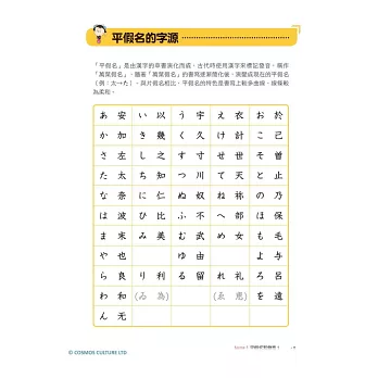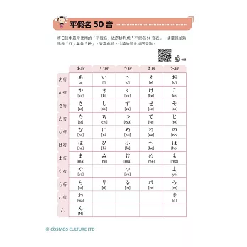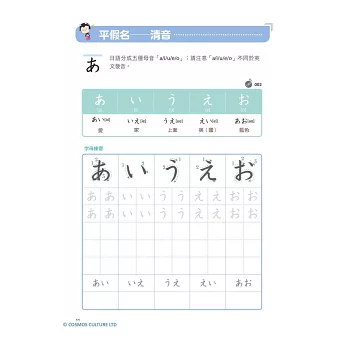 從假名的發音、筆順、單字,到拗音、促音、長音的介紹,還有提醒讀者常被忽略的日文特殊音,按部就班從頭開始一一詳細介紹。
