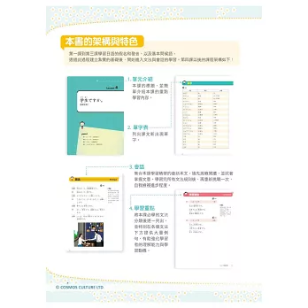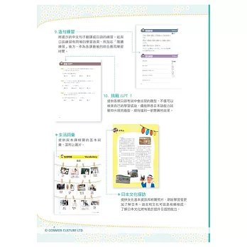 會話本文是課程學習精華,學習者可以試著閱讀掌握文意,接著在學習完所有文法規則後,再重新挑戰一次,自我檢視進步程度。