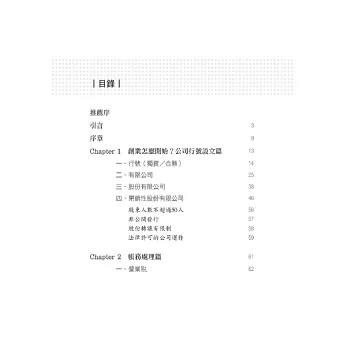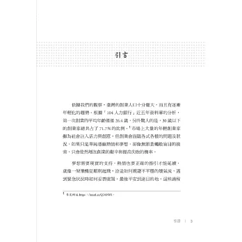 本書規劃四個章節,從最讓新創青年困惑不解的法規、稅務、股權、財務報表等實務面向,以淺顯易懂的情境故事,為想要創業的夢想家指點迷津。