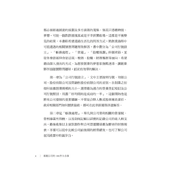 ★帳務處理:舉凡與公司營利相關的營業稅、營利事業所得稅,以及如何記帳以詳實的記錄公司的收入與支出。
