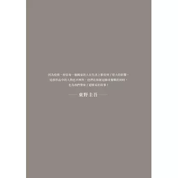 於是,故事總會回到最初,理解謊言與秘密的互為表裡,理解一段故事的曲折,理解一個人,最終所要的理解不是他者,而是自身,東野圭吾總在故事裡寫下此般的光潔鏡面,使閱讀者從中看見自我。