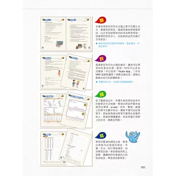 學習完緊湊的課程之後,整理出章節內出現過的發音、字彙、文法,設計課後複習,加深學習記憶。章節最後再附上習題,讓讀者即時掌握自己的吸收程度,學習成效看得見!