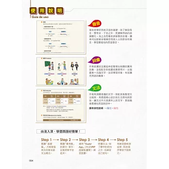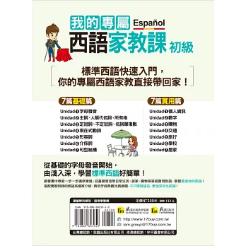 嚴選7大生活單元,每個單元分成聽、說、讀、寫。全書完全符合西語檢定DELE A1程度考試範圍,讀者不僅可以學會在日常生活中應用初級的西語,也能夠輕鬆準備西語檢定考試!