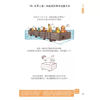 ◎人類最早發明的水上交通工具原來是獨木舟、為什麼大輪船的螺旋槳反而那麼小、世界上第一輛地鐵的車廂是露天的啦、剎車和油門為什麼要一高一低、熱氣球的第一批乘客竟然是幾隻小動物、史上第一架飛機原來只飛了12秒、為什麼噴射機飛過天空會留下一道白煙、你知道買一件太空衣要多少錢嗎……