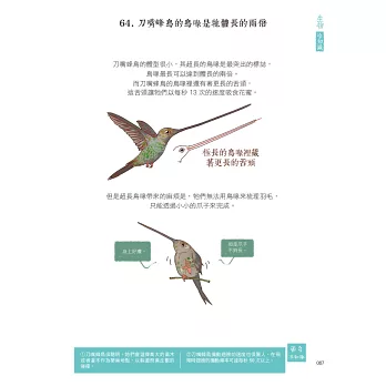 ◎在恐龍出現之前,奇蝦早稱霸了地球、蛇頸龍長長的脖子不如你想像中的靈活、最早的烏龜根本沒有強大的硬派龜殼、六角恐龍不但可以再生四肢,還能再生大腦和心臟、有位叫海參的但卻不會游泳、變色龍變色的目的才不是只為了偽裝、蝴蝶的鼻子其實長在觸角上、食蟻獸很長舌、北極熊的皮膚是黑色的、馬常站著睡覺的……