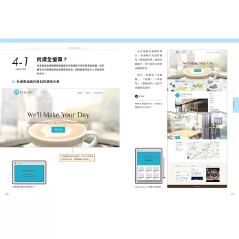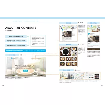 學了基礎當然要活用,本書的後半部,就以一個專業的【咖啡店網站】實例,帶著你從零開始做起。只要跟著練習,你就能慢慢做出這個簡單漂亮的網站,並在過程中學會製作各種常用的功能,例如:【全螢幕網頁】、【兩欄式網頁】、【磚牆式網頁】、【聯絡我們】、【載入 Google 地圖】…等。這些實用的技巧,未來都能活用在你自己做的網頁中喔!