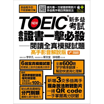 在全新打造的高手影音解說版中,擁有多益金色證書的多益高手將會現身說法分享自身經驗,從立定讀書計畫、讀書技巧分享、到新舊制多益閱讀題型比較分析,以及針對考試當天各大題的時間分配、解題方法和考試技巧進行地毯式的詳細分析。