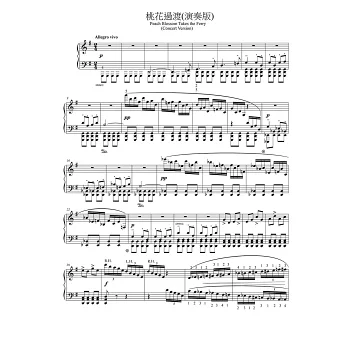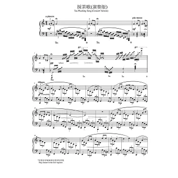 《採茶歌》傾向以炫技、浪漫的改編方式寫作而成。其中參考了葛利格的伴奏型態、史克里亞賓的低音寫作方式,最後以改變拍子的方式呈現華麗的終曲,是一首能完整呈現鋼琴家技術與鋼琴性能的作品。《桃花過渡》是一首同時流傳在客家與閩南族群的曲調,在許常惠教授所著《現階段台灣民謠研究》一書中,可以很清晰的發現客語版與台語版的《桃花過渡》的異同之處。《桃花過渡》以連貫的四樂章小奏鳴曲譜寫而成,所有的樂章素材及音樂動機皆來自桃花過渡的主旋律片段,四樂章以「動、靜、活、炫」展現桃花過渡中男女俏皮對話的精髓。本次出版為了讓各種程度的鋼琴演奏者可以演奏此曲,每首皆特別寫了「演奏版」與「簡易版」兩種版本,希望更廣泛地被鋼琴演奏者彈奏。