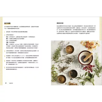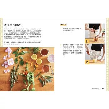 簡言之,浸漬蜂蜜是將新鮮香草或香料加入生蜂蜜,使食材浸泡一段時間。書中提到的製程,都不需要加熱。然而,浸漬蜂蜜要經常攪拌,通常置於陽光下2-6週,好讓蜂蜜能吸收植物的風味與益處。完成後,將香草或香料瀝掉。風味被強化的蜂蜜能單吃,或是加入其他食譜。