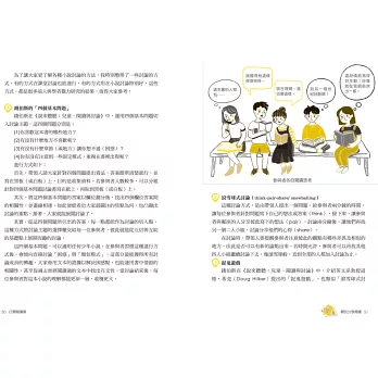 亮點二,當小讀者拿起一本少年小說,沉浸其中,心思和書中的人物遭遇、行動、結局交織在一起時,讀者需要時間進行安靜或激烈的內心對話,如果有機會說出來讓自己聽到,讓他人聽到,有時自己都會嚇一跳,發現自己透過閱讀書籍成為一個新的人了!因此在小說的長文閱讀上,我非常支持錢伯斯的四個基本問題,很高興琦霞和我有共識。是的,「分享閱讀」才是少年小說閱讀和討論的關鍵概念。有時,局外人「碎碎地提問」是轟隆作響的割草機,剷平了雜草,也趕跑了愛聞花香的蝴蝶,和棲息樹枝歌唱的小鳥,中斷了讀者的思考和閱讀的趣味。在這本書中關於「分享閱讀」,琦霞很有想像力地說,這是「挖寶」,而且在書中有幾本小說的討論過程,她還加入戲劇元素,著實讓挖寶很有氣氛、畫面十足。