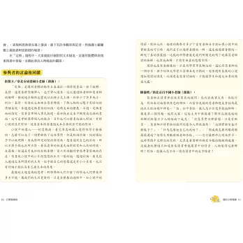 亮點三,我也要打亮書中所提的「討論前的準備」。開頭、敘事觀點、文句、張力和主題,這五項是有心推動各項文本閱讀的老師們要做好的基本功。踏實地做好這些準備,敢用、善用、恰如其分的運用這些語彙,是閱讀老師們「言之有物、言之有味」的基礎,這樣才有底子和小讀者一起領略這些要素的共同運作結果,進而成為具有鑑賞力的大、小讀者。琦霞在這書中做了很好的示範,她沒有讓我們戴著模糊、不對焦的眼鏡,霧裏看花。