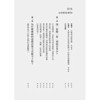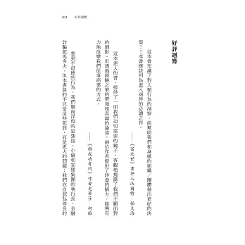 閱讀本書能讓你戴上行為倫理學的濾鏡,有效看見個人、組織、社會三個層次的思考盲點,並提出具體可行的做法。所有讀者都能從書中學到如何避免為錯誤決策付出慘痛代價,並遵循更對得起自己的行為準則;任職於組織企業的讀者,將懂得打造符合人性基礎與公司目標的有效遊戲規則,防止系統性的失敗;團體的領導者,也能運用書中的智慧,創造出更為具體可行的政策,成就更好的社會。
