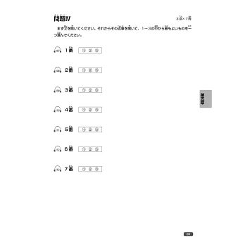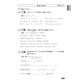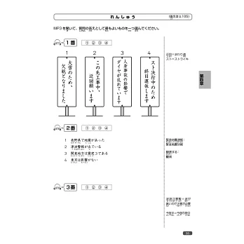 各章皆有一回「まとめ問題」確認讀者的理解程度。第5章的總練習題(総まとめ問題)是以日檢形式出題的模擬測驗。大量的練習題,讓學習者可自我檢核學習成效,同時熟悉日檢題型,增強信心,確實提升聽解能力。