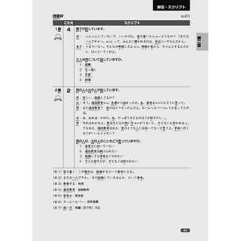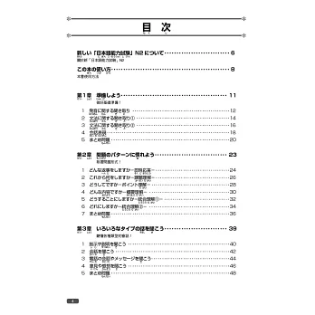 針對日檢N2聽解5大題型舉例說明。在解答練習題的同時熟悉出題形式。5大題型包含:「課題理解」、「重點理解」、「概要理解」、「即時應答」及「統合理解」,除了說明不同的出題流程,也指出問題核心,幫助讀者徹底掌握解題關鍵。