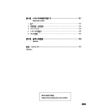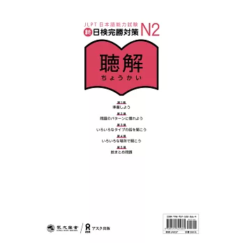 〈聽解〉的關鍵是「聽到並且理解」,不只要聽到正確單字,還要能辨別句意,因此需要階段性訓練及技巧指點。本書規劃五大章,前四章從「發音」、「句型∕文法」、「會話表現」到「日檢題型」逐步訓練,延伸展開各種「主題」、「場合」並擴充「詞彙」,每日一個焦點訓練,內容由短逐漸加長。第五章則是總練習題,以4週完成訓練目標!