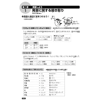 一開始著重在容易出錯的發音或語法等基礎訓練上,為聽懂稍長的內容做好準備。例如相似發音的單字、一般教材較少介紹的「縮略形」練習、易混淆的被動、使役、敬語等較難的文法,及會話裡特有的活用語法,像是「行かないわけにはいかない」是要去還是不去?透過各種短句及會話,扎實奠定基本功。