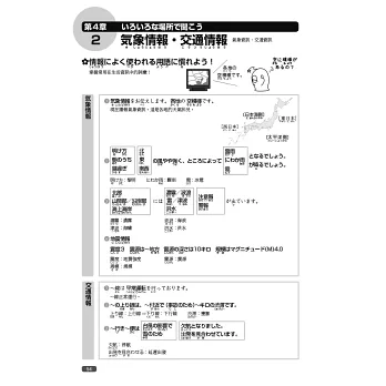 以生活資訊分類,掌握各種場合常用的表達方式及關鍵詞彙。如電車或店家賣場資訊,氣象或交通資訊,校園內的廣播、美髮、餐廳、宅配、租屋等。