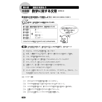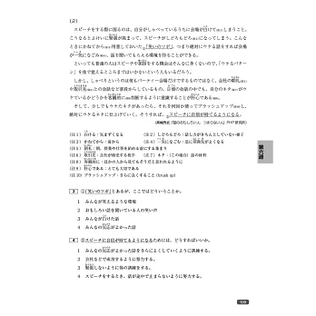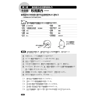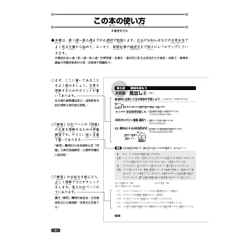 每週第1到第6天,每日兩頁的學習主題有三步驟。首先,「語法要點」會條列出當日的學習重點。其次,透過「練習」中的會話,增加對閱讀內容的理解能力。最後,以「問題」內容作實際演練,確認是否已融會貫通。第7天「實戰問題」,則是針對該週學習內容的總測驗。