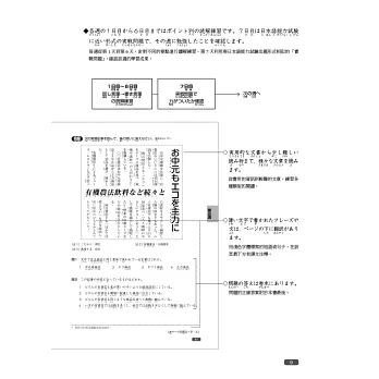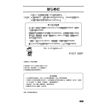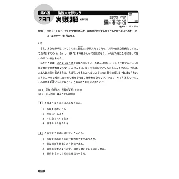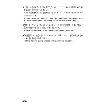 前6天的「問題」練習,是藉由不同類型的文章讓讀者即學即練。第7天的「實戰問題」,則以日檢形式出題,須限時完成,書末有解答與較難句型的解說。即使未能在規定時間內做完,透過多次的練習,亦能有效提升閱讀速度,同時熟悉日檢題型,增強信心。