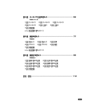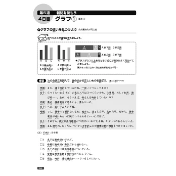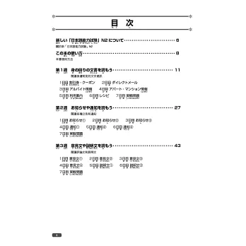 搭配日檢讀解出題形式,利用各類型文章,由淺入深,訓練掌握閱讀重點的技巧,六週共分為6個訓練主題:生活中常遇到的情報資訊、各種通知單、意見評論與說明文、隨筆和小說、新聞報導及論說文。