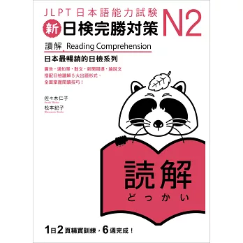 《新日檢完勝對策N2:讀解》以不同內容形式進行讀解練習,從廣告、通知單等日常生活較常接觸的文件,循序漸進到散文、報導、議論文等難度較高的文章。分析資訊與理解技巧,雙管齊下。對於讀通文章所需的基礎文法,如接續表現、指示詞、功能詞等,加強解說,逐步提升閱讀理解的能力,以6週完成訓練目標。