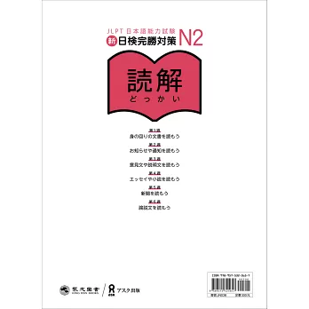「新日檢完勝對策」系列為由「JLPT日本語能力試驗」教材權威佐佐木仁子、松本紀子老師共同執筆,為考生規畫兩個月的應考讀書計畫。全套書籍從N5至N1分級共15冊,扎實奠定〈文法〉〈讀解〉〈聽解〉及〈漢字‧語彙〉四大基礎。