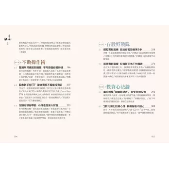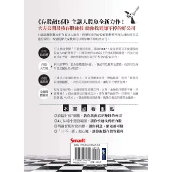 41歲就離開職場的存股達人股魚認為,個人和公司相比,當然是公司的賺錢效率高。既然如此,乾脆就把資金交給公司,讓公司幫自己賺錢。至於什麼樣的公司可以幫自己賺錢呢?最好是那種公司名稱雖然很少人聽過,但卻賺得肥滋滋的公司。這種公司一旦被挖掘出來公開亮相,股價將不可同日而語。只要能夠找出這種具潛力的好公司,並且長期持有,就能帶來豐厚的獲利。至於該怎麼做呢?別擔心,股魚已經擷取歷年來的存股精華放入書裡,並由淺至深地進行說明,希望能帶大家找到可以幫你賺不停的好公司。