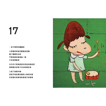 書中文字赤裸裸地展現了奈良美智心中的風景,他透過這些文字,帶領我們在那現實與虛幻的國度飛翔,有時聽音樂,有時看夕陽,更多時候什麼也不做,只是靜靜望著月夜、森林或星光。唯一不變的,是他對創作的熱情,正如書中最後篇章所寫:
