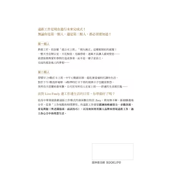 遠距工作,不只是一種工作選擇,而是能讓你藉由彈性規畫,找回人生掌控權的生活選擇,如果你也對遠距工作充滿好奇,想要一探究竟,Zoey這本書絕對能從各個面向協助你,幫你脫離框架,創造專屬於你的生活!