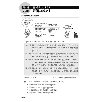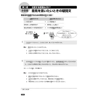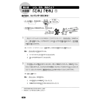 每週第1到第6天,每日兩頁的學習主題有兩步驟。首先,先提示理解文章所需的技巧。其次,從1~3句的小短文至中長篇文章練習,逐步掌握閱讀的理解能力。第7天「實戰問題」,則是針對該週學習內容的總測驗。