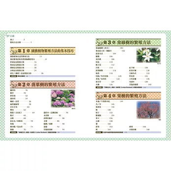 植物繁殖有實生、扦插、嫁接、壓條、分株等各種方法。在本書中將於第1章用照片和插圖介紹這些繁殖方法,不論是誰都能實際操作。第2至6章則是從落葉樹、常綠樹、果樹等樹木到觀葉植物、盆花、山野草、香草等,盡量列出許多能在家庭栽培的植物,並以簡單的插圖解說繁殖方法和管理重點。