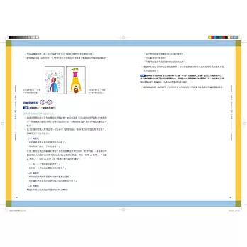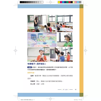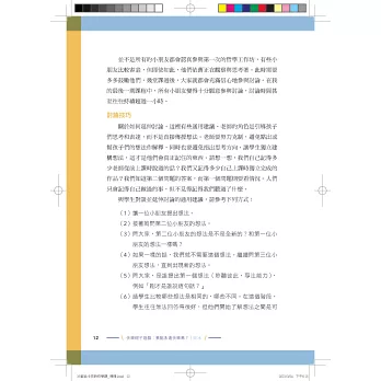 本書的第二大特點,就是無私給予第一線的教育工作者一份實用的教材,不論是教學法的內容說明和建議,或是附帶的範例教學,都十分具體且清楚易懂,讓老師們可以透過有系統的方法,循序漸進探討各個不同的哲學主題。當我們進入哲學工作坊每一單元的課程內容時,都可以透過下列三種不同的角度結合創作和哲學: